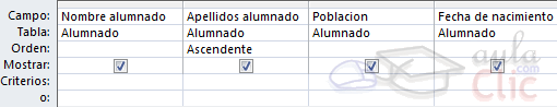 Empezaremos por crear una consulta donde aparecerán los campos Nombre, Apellidos, Población y Fecha de