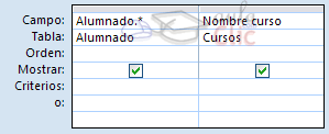 Con la primera columna indicamos que queremos todos los campos de Alumnado y con la segunda columna, el nombre del curso asignado al alumno.