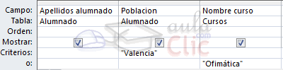 Crearemos una consulta a partir de dos tablas relacionadas. La consulta contendrá como datos los apellidos del alumnado, su población y nombre del curso al cual asiste, pero de aquellos alumnos que sean de Valencia o bien aquellos que se encuentren en el curso de Ofimática.
