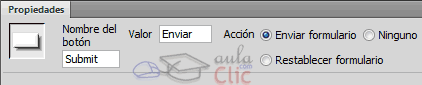 Es el botón tradicional de Windows. El botón puede tener asignadas tres opciones: Enviar formulario, Restablecer formulario (borrar todos los campos del formulario), o Ninguna (para poder asignarle un comportamiento diferente de los dos anteriores).