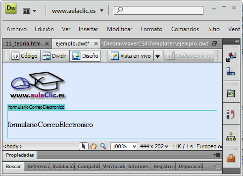 En este caso, la imagen con el logotipo de aulaClic aparecería en todas las páginas que se basaran en esta plantilla, mientras que todo lo que insertáramos dentro de la zona editable FormularioCorreoElectronico podría ser modificado.
