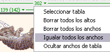 Si tienes el cursor en la tabla y no te aparece esa zona verde puedes activar su visualización seleccionando la opción Anchos de tablas del menú Tabla o también desplegando de la barra de menús, el menú Ver, Ayudas visuales, Anchos de tabla. De la misma forma se desactiva su visualización. Si no aparece el ancho de la tabla o de una columna, la tabla o la columna no tiene un ancho especificado, si aparecen dos números, el primer número corresponde al ancho especificado en las propiedades de la tabla o columna y el segundo número es el ancho el ancho visual que aparece en la vista de diseño, por ejemplo en la tabla anterior la primera columna tiene 139 (142), en las propiedades de la celda tenemos el ancho 139 píxeles pero al contener una imagen que necesita más espacio, la columna ocupará realmente 142 píxeles (ancho visual de la columna tal como aparece en la pantalla).