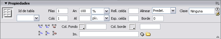 A través del inspector de propiedades se pueden modificar los valores que se especificaron al insertar la tabla. Al mismo tiempo, pueden indicarse otros como pueden ser el valor Alinear (que permite alinear la tabla a la izquierda, al centro o a la derecha), el color de fondo (en Col. Fondo) o de borde de la tabla (en Col. borde ), o la imagen de fondo (en Im.). Si lo que se selecciona es una celda, o un conjunto de celdas, el inspector de propiedades cambia, para permitir especificar otros valores.