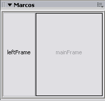 | Para seleccionar los marcos del documento es necesario dirigirse al panel Marcos, que puede abrirse a través del menú Ventana. Si la opción Marcos no te aparece directamente en este menú, posiblemente esté dentro de la opción Otros. También puedes abrir el panel Marcos pulsando la combinación de teclas Mayús+F2. En el panel Marcos aparecen los marcos que contiene el documento de marcos, y se puede pasar de uno a otro pulsando sobre ellos en el panel. También puede seleccionarse la página de marcos pulsando sobre el borde que rodea a los marcos (el que aparece más grueso y en relieve en la imagen). No es necesario seleccionar los marcos para editar los documentos que éstos contengan. Sí es necesario seleccionar los marcos para especificar las propiedades específicas de cada uno de ellos. |