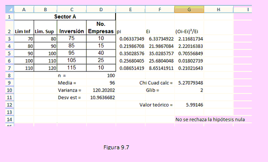 Ahora bien, la columna D contiene los Oi, la columna F los Ei; con ellos hemos calculado G. En G9 se tiene el valor del estadístico de la prueba.