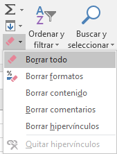 - Borrar todo: Elimina el contenido de las celdas seleccionadas, los comentarios ligados a esas celdas y cualquier formato excepto la anchura de la columna y la altura de la fila.