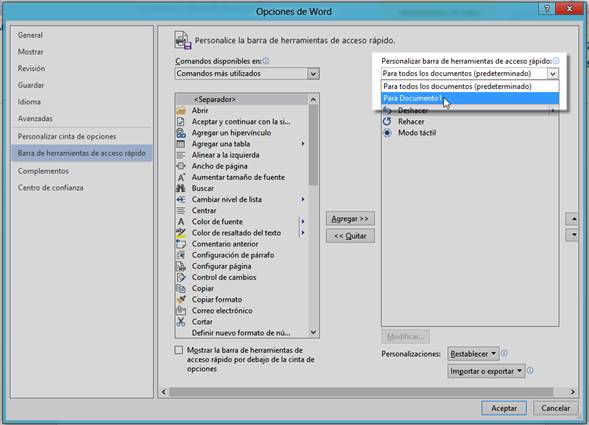 En esta lista podrá elegir si los comandos de la Barra de herramientas de acceso rápido aparecerán en todos los archivos o simplemente en el archivo actual.