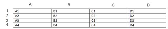 El punto de inserción indica que puede comenzar a escribir en una tabla, si desea pasar a la siguiente celda, basta con pulsar la tecla TAB. Cuando llega al final de la celda, al pulsar nuevamente TAB, regresará a la primera celda de la siguiente fila. Tenga en cuenta que una tabla tiene la misma estructura que las celdas de Excel, es decir, tienen un nombre idéntico, vea el siguiente gráfico y nótelo.