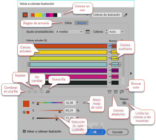 ), pueden ser sustituídos todos por el color que elijamos, o que el color sustituto cree una escala de tonos, o diversas opciones, que podemos elegir al desplegar una pestañita que aparece cuando nos situamos sobre el color.
