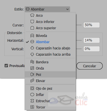 Para crear la envolvente con una de las formas predefinidas, seleccionamos el objeto (u objetos) y vamos al menú anterior y elegimos Crear con deformación. En el caso de elementos de texto, podemos hacerlo directamente a través del botón Envolvente