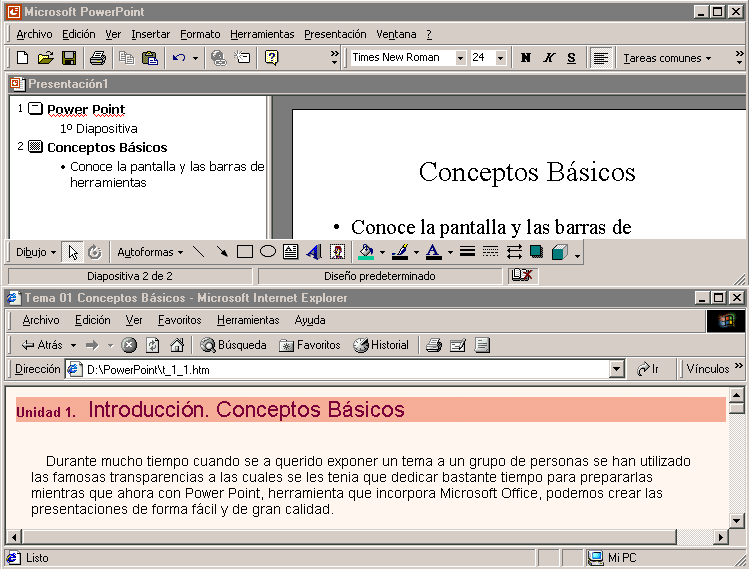 | Aquí te explicaremos cómo conseguir tener la pantalla dividida en dos partes, una con la sesión deI curso y otra con el PowerPoint2002. 1 Se supone que tienes abierta la sesión con el curso. 2 Abrir la sesión de PowerPoint2002 sin cerrar la ventana del navegador. 3 Pulsar con el botón derecho sobre cualquier parte vacía de la barra de tareas, en la parte inferior de la pantalla. 4 Elegir la opción Mosaico vertical. Observa como la pantalla habrá quedado dividida en dos partes, como en la figura: