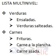 Al pulsar TAB antes de introducir un nuevo elemento indicamos que este está un nivel inferior que el anterior, es decir, indicamos una dependencia. Esto da lugar a las listas multinivel. Las listas multinivel pueden ser tanto de viñetas como numéricas.