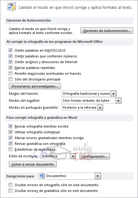 Debemos dejar sin marcar las casillas Revisar ortografía mientras escribe y Marcar errores gramaticales mientras escribe.