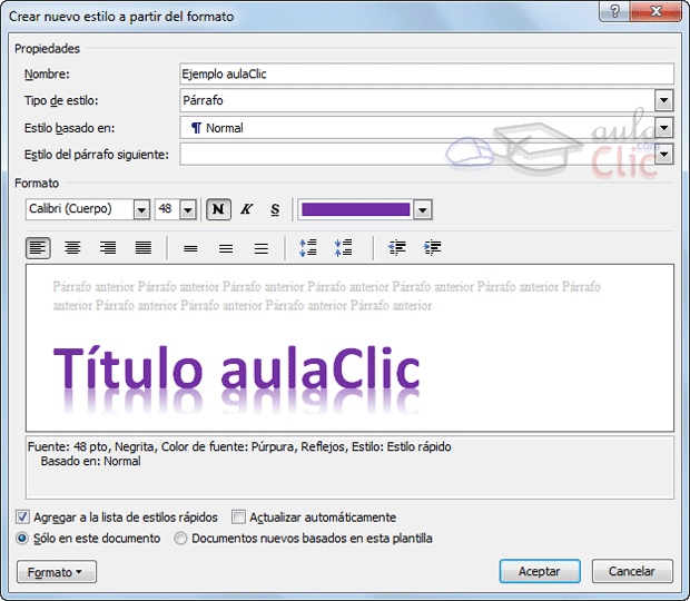 Al crear y modificar estilos tenemos que rellenar un cuadro de diálogo con algunos cuadros y casillas de verificación que conviene explicar con un poco de detalle. Es lo que vamos a hacer en este tema avanzado.