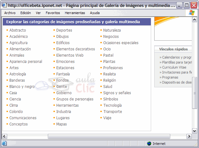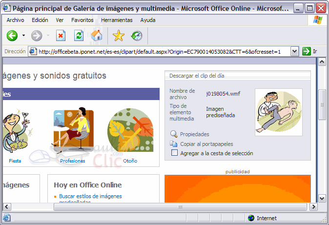 En la parte inferior si hacemos clic en Imágenes prediseñadas de Office Online abrirá el navegador Web y entrará directamente en la web de Microsoft, en una página similar a la que ves en la siguiente imagen: