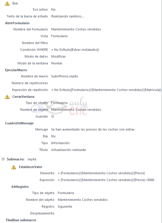 - La Expresión de repetición la definiremos de la siguente forma: No EsNulo([Formularios]![Mantenimiento Coches vendidos]![Matricula]) ya que todo coche vendido tiene asignado una matrícula, y así nos aseguraremos de que la macro repite se repita para todos los coches del formulario.