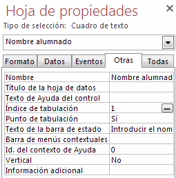 Índice de tabulación: Es una de las propiedades más interesantes de los controles sobre todo de formularios. Te permite establecer en qué orden saltará el cursor por los controles del formulario/informe cuando pulses la tecla TAB. El primer elemento deberá establecerse a 0, luego el salto se producirá al control que tenga un valor inmediatamente superior. Pulsando en el boton