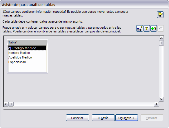 Aquí deberás seleccionar los campos que contengan datos duplicados y arrastrarlos fuera para formar nuevas tablas.