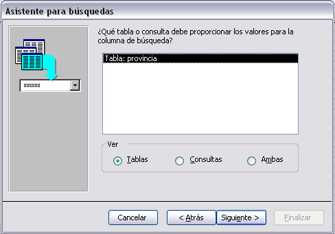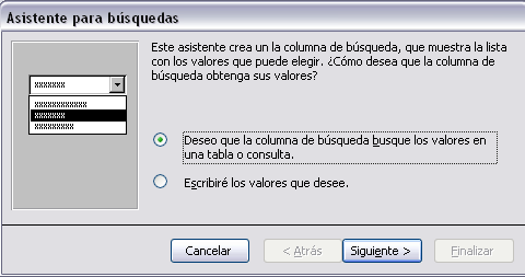 Si la columna de búsqueda está basada en valores extraidos de una tabla o consulta, en la primera ventana del asistente para búsquedas deberemos seleccionar la primera opción Después de pulsar el botón Siguiente aparece la siguiente ventana: