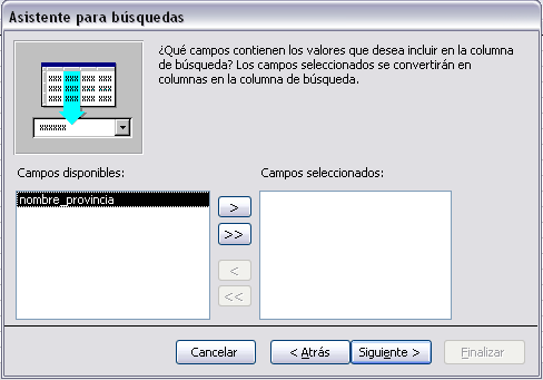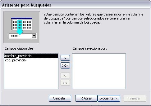 En esta ventana tenemos en la lista de la izquierda las columnas de la tabla o consulta elegida y en la lista de la derecha iremos colocando las columnas que queremos aparezcan en la lista de búsqueda. Para seleccionar una columna hacer clic