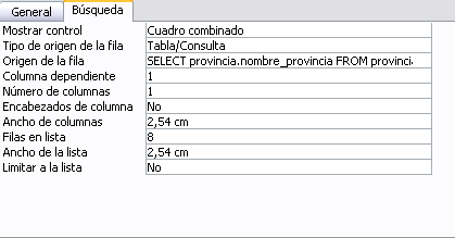 Con el asistente hemos definido el campo con una lista de búsqueda basada en una tabla, esto se ve reflejado en las propiedades del campo en la ficha Búsqueda de la siguiente manera: