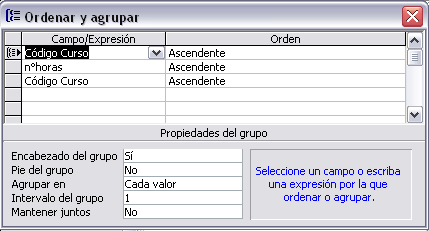 aparecen con el símbolo El orden en que ponemos los diferentes campos es importante. En el ejemplo anterior, primero hemos escrito Nombre Curso, después nºhoras y al final Código Curso, esto hará que primero se agrupen los registros por Nombre Curso, dentro de un mismo nombre de curso se ordenarán los cursos por nºhoras, y dentro del mismo número de horas se ordenarán por código de curso. Podemos crear hasta diez niveles de agrupamiento, estos niveles estarán anidados (uno dentro de otro) en el mismo orden que aparecen en el cuadro Ordenar y agrupar:
