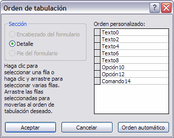 En él aparecen todos los controles ordenados por su orden de tabulación. Puedes arrastrar y colocar los controles en el orden que prefieras, de esta forma, las propiedades Índice de tabulación de los controles se configurarán de forma automática. |