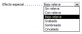 Al modificar esta propiedad algunos de los valores introducidos en las propiedades Color del fondo, Estilo de los bordes, Color de los bordes o Ancho de los bordes se verán invalidadas debido a que el efecto elegido necesitará unos valores concretos para estas propiedades. Del mismo modo si modificamos alguna de las propiedades citadas anteriormente el Efecto especial dejará de aplicarse para tomarse el nuevo valor introducido en la propiedad indicada.