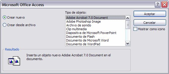 Se abrirá el cuadro de diálogo que vimos anteriormente cuando queríamos insertar un objeto en un Marco independiente.