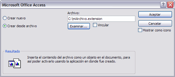 En el momento en el que estamos insertando el objeto desde un archivo deberemos marcar la casilla Vincular si queremos que el archivo no se incruste en la base de datos y pueda ser manipulado directamente desde fuera.