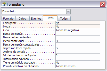 Aquí podrás modificar los valores de las propiedades Emergente y Modal de la ventana del Formulario o Informe.