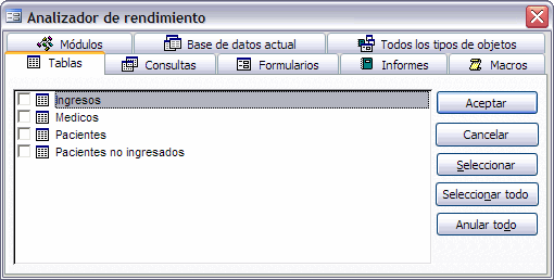 Si ya has analizado tu base de datos y quieres volver a analizarla, será conveniente analizar únicamente los objetos nuevos o los que hayan cambiado, en este caso haz clic sobre la pestaña del tipo de objeto a analizar y luego en la lista que te aparecerá marca la casilla del o de los objetos que quieres analizar.