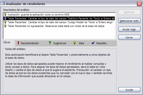 Si Access devolviese alguna Sugerencia o Recomendación podríamos seleccionarla y pulsar el botón Optimizar para actualizar la base de datos de forma que se apliquen los cambios aconsejados. En este caso el resultado aparecerá marcado con el símbolo de Resuelto.