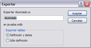 Como puedes ver en la imagen, estamos exportando una tabla llamada Alumnado a una base de datos llamada prueba.mdb.