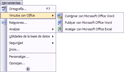 También, desde la opción Vinculos con Office del menú Herramientas, podremos exportar el contenido de nuestras tablas, informes o formularios a aplicaciones del mismo paquete como Word o Excel.