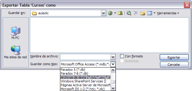 En el caso de exportar el contenido de una tabla a un archivo de texto podremos marcar la opción Con formato (a la derecha de Nombre de archivo).