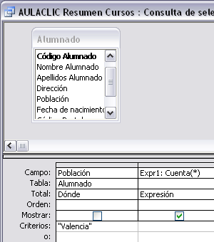 Por ejemplo queremos saber cuántos alumnos tenemos en cada población. Tenemos que indicar que queremos contar los registros de la tabla Alumnado pero antes agrupándolos por el campo Poblacion. De esta manera la función cuenta() la calculará sobre cada grupo de registros (los alumnos de la misma población). La consulta quedaría así: