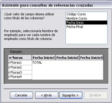 En esta ventana el asistente nos pide introducir el encabezado de columnas. Aquí sólo podemos elegir un campo y por cada valor distinto existente en el origen, generará una columna con el valor como encabezado de columna. En la parte inferior de la ventana se puede ver cómo quedará el resultado, vemos que al seleccionar el campo Fecha Inicio, aparecerá en el resultado de la consulta una columna por cada valor que se encuentre en la columna Fecha Inicio de la tabla Cursos. Como el campo que hemos elegido como encabezado de columna, es de tipo Fecha, el asistente nos permite refinar un poco más el encabezado de columna con la siguiente ventana: