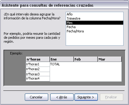 Cuando el encabezado de columna es una fecha, normalmente querremos los totales no por cada fecha sino por mes, año o trimestre por eso el asistente nos pregunta en esta ventana qué tipo de agrupación queremos. Por ejemplo hemos seleccionado el intervalo Mes, pues en el resultado aparecerá una columna por cada mes del año en vez de por cada fecha distinta. Aquí también podemos apreciar el efecto en la zona inferior de la ventana. Después de pulsar el botón Siguiente> pasamos a la siguiente ventana: