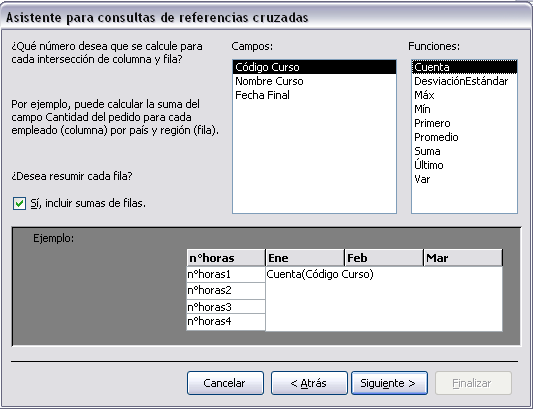 En esta ventana nos pregunta qué valor debe calcular en la intersección de columna y fila. En la lista Funciones: seleccionamos la función de agregado que permite calcular ese valor, y en la lista Campos: elegimos el campo sobre el cual actuará la función de agregado. Por ejemplo hemos seleccionado Codigo Curso y la función Cuenta, por lo tanto en cada intersección tendremos el número de cursos iniciados en ese mes con ese nº de horas. Si tienes dudas sobre las funciones de agregado repasa el tema Consultas de resumen. El asistente nos permite también añadir a la consulta una columna resumen de cada fila, esta columna contiene la suma de los valores que se encuentran en la fila. En nuestro ejemplo me daría el número total de cursos con el nº de horas de la fila. Para que el asistente añada esta columna tenemos que activar la casilla Sí, incluir suma de filas. Después de pulsar el botón Siguiente> llegamos a la última ventana del asistente que puedes ver en la siguiente página... |
