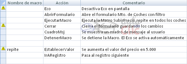1 Haz clic en Macro en la pestaña Crear para crear una nueva Macro. 2 Guarda la Macro desde Botón de Office → Guardar 3 Dale el nombre de SubirPrecio. Primero desactivaremos el Eco de pantalla para que no se vean las acciones de la Macro. 4 En la primera fila selecciona Eco en la columna Acción. 5 Nos dirijimos a la parte inferior donde encontramos los Argumentos de la acción. Allí seleccionamos No en Eco activo. 6 Escribe Realizando cambios... en Texto de la barra de estado. Ahora abriremos el formulario donde haremos los cambios. 7 En la siguiente fila selecciona en la columna Acción la acción AbrirFormulario. 8 En los Argumentos de acción seleccionamos Mantenimiento Coches vendidos en Nombre del formulario. 9 Modificaremos la opción Condición WHERE para que pueda leerse No EsNulo([Extras instalados]) para que se cargue el formulario filtrando los registros cuyo campo Extras instalados no sea nulo. 10 Cambia la opción Vista a Formulario. 11 Cambia la opción Modo de datos a Modificar. 12 Cambia la opción Modo de la ventana a Normal. 13 En la siguiente línea selecciona la Acción EjecutarMacro. 14 En los Argumentos de acción escribe SubirPrecio.repite en la opción Nombre de macro. 15 En expresión de repetición escribe No EsNulo([Formularios]![Mantenimiento Coches vendidos]![Matricula]) para que se repita la Macro repite para todos los coches en el formulario (todos tendrán número de matrícula). Ahora nos desplazaremos unas cuantas líneas para colocar el bucle. 16 Baja unas 5 o 6 líneas y en Acción selecciona EstablecerValor. 17 En los Argumentos de Acción escribe [Formularios]![Mantenimiento Coches vendidos]![Precio] en Elemento para modificar el Precio del coche. 18 En Expresión escribe [Formularios]![Mantenimiento Coches vendidos]![Precio]+5000 para aumentar su Precio en 5000. 19. Pulsa el botón Nombres de macro para que se muestre la columna de los nombres. 20. Escribe en la columna del nombre, de la acción EstablecerValor, el nombre repite. 21 En la siguiente línea selecciona la Acción IrARegistro. 22 En Argumentos de acción selecciona Formulario en Tipo de objeto. 23 En Nombre del objeto selecciona Mantenimiento Coches vendidos. 24 En la opción Registro selecciona Siguiente. Ya hemos terminado con el bucle. Modificará el campo Precio y luego pasará al siguiente hasta que no quede ninguno. Ahora volveremos de nuevo a la línea que dejamos después de EjecutarMacro. 25 En la línea debajo de EjecutarMacro selecciona la acción Cerrar para cerrar el formulario. 26 En los argumentos de acción selecciona Formulario en Tipo de objeto. 27 En Nombre del objeto selecciona Mantenimiento Coches vendidos. 28 Selecciona Sí en la opción Guardar para que se cierre el formulario guardando los cambios. 29 En la siguiente fila selecciona la Acción CuadroMsj. 30 En los argumentos de acción escribe Se han aumentado los precios de los coches con extras. en la opción Mensaje. 31 Cambia la opción Bip a No. 32 Cambia la opción Tipo a Información. 33 En la opción Título escribe Actualización realizada. Finalmente detendremos la Macro para que no siga ejecutándose. 34 En la siguiente fila añade la acción DetenerMacro.
