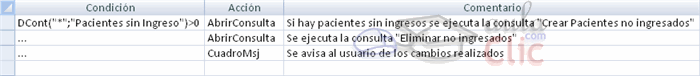 Para conseguir el objetivo de este apartado antes deberemos crear una consulta que utilizaremos para ver si existen o no pacientes sin número de ingreso. 1 Haz clic en el botón Diseño de Consulta de la pestaña Crear. 2 Selecciona la tabla Ingresos y pulsa Agregar. 3 Selecciona la tabla Pacientes y pulsa Agregar. 4 Haz clic en el botón Cerrar para empezara generar la consulta. 5 Ahora haz doble clic sobre la línea de relación existente entre las dos tablas para acceder a sus propiedades. 6 Selecciona la opción Incluir TODOS los registros de 'Pacientes' y sólo aquellos registros de 'Ingresos' donde los campos combinados sean iguales y pulsa Aceptar. 7 Haz doble clic sobre Código Paciente para añadirlo la consulta. 8 Haz doble clic sobre Nºingreso para añadirla a la consulta. 9 En Nºingreso escribe Es Nulo en la fila Criterios:. 10 Desactiva la casilla Mostrar: para el campo Nºingresos. El resultado será un listado de números de Códigos de Paciente que no tienen ingresos. 11 Guarda la consulta como Pacientes sin Ingreso y cierrala. Ahora crearemos la Macro que necesitamos. 12 Ves a la pestaña de Macros en la ventana de la base de datos y haz clic sobre ella. 13 Selecciona la Macro AutoExec que creamos en el apartado anterior y haz clic en Diseño 14 Activaremos la opción de Condiciones haciendo clic en el botón Condiciones en la pestaña de Diseño. 15 En la primera fila escribiremos en la columna Condición lo siguiente: DCont("*";"Pacientes sin Ingreso")>0. Esto evaluará si el número de registros en la consulta Pacientes sin Ingreso es mayor que 0. En caso afirmativo ejecutaremos las acciones que nos piden. 16 En la primera fila seleccionaremos la acción AbrirConsulta. 17 En los argumentos de la acción seleccionaremos Crear Pacientes no ingresados en Nombre de la consulta. 18 En la siguiente línea selecciona de nuevo otra acción AbrirConsulta. 19 En los argumentos de la acción seleccionaremos Eliminar no ingresados en Nombre de la consulta. 20 Finalmente seleccionaremos la acción CuadroMsj en la última fila. 21 En argumentos de la acción escribe @Existen pacientes sin ingreso@Se han transladado a la tabla 'Pacientes no ingresados'@ en la opción Mensaje. 22 Cambia la opción Bip a No. 23 Cambia la opción Tipo a Aviso: !. 24 Escribe Pacientes sin Ingreso en la opción Título. 25 Ahora viene la parte más importante, deberás añadir puntos suspensivos en la columna de Condición para todas las acciones que hemos escrito, de esta forma sólo se ejecutarán si se cumple la condición que escribimos en la primera línea para la primera acción. Una vez lo tengas habrás acabado.