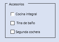 Dentro del Cuadro de grupo colocamos casillas de verificación. Cada casilla corresponde a un accesorio que podemos añadir a la vivienda seleccionada y el usuario puede comprarla o no. Si se activa la casilla, se entiende que se desea la vivienda con ese accesorio y, por tanto, el precio de la vivienda se incrementa. Los accesorios disponibles son: