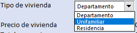En el primer control seleccionamos el tipo de vivienda a adquirir en este caso hipotético. Puede ser un departamento, una vivienda unifamiliar o una residencia. Para seleccionarla, utilizamos un control de cuadro combinado