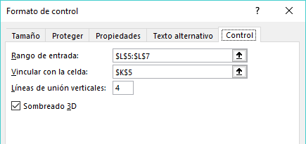 - Vincular con la celda. Es la celda donde va a presentar el número del ítem de la lista seleccionado.