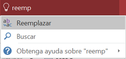 Por ejemplo, si no recordamos donde está el comando Reemplazar, empezamos a escribir "reemplazar" en la caja de búsqueda de ¿Qué desea hacer? y al escribir las primeras letras veremos como aparece el comando Reemplazar, tal y como muestra la siguiente imagen.