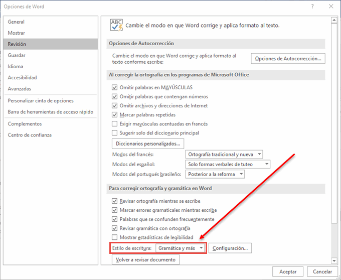 En tanto, si quieres una revisión gramatical más extensa de tu documento, debes confirmar que está activada en el menú Archivo, en el menú Opciones. Después en la categoría Revisión, seleccionar la opción de Estilo de escritura: Gramática y más.