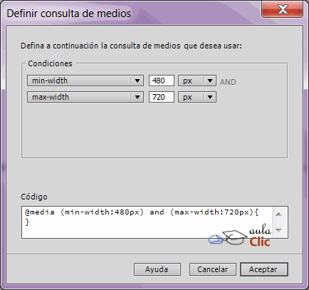 de la sección @Medios, se abre un cuadro de diálogo donde definimos las características del dispositivo para el que vamos a crear reglas de estilo. Por ejemplo, supongamos que deseamos crear reglas de estilo para todos nuestros selectores CSS para el caso de que nuestra página sea vista en pantallas de 480px como caso mínimo y máximo de 720px.