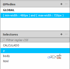Al pulsar Aceptar, la consulta de medios pasa a formar parte del subpanel @Medios. Al hacer clic en la consulta, la pantalla se ajustará a la misma y podemos añadir selectores CSS con propiedades que se aplicarán cuando la página sea vista en dispositivos que cumplan con las condiciones. Por ejemplo, en la siguiente imagen, podemos ver que ya está definida y seleccionada la consulta, por lo que podemos crear reglas de estilo para los párrafos (etiqueta <p>) o añadir cualquier otro selector, de clase, ID, etcétera.