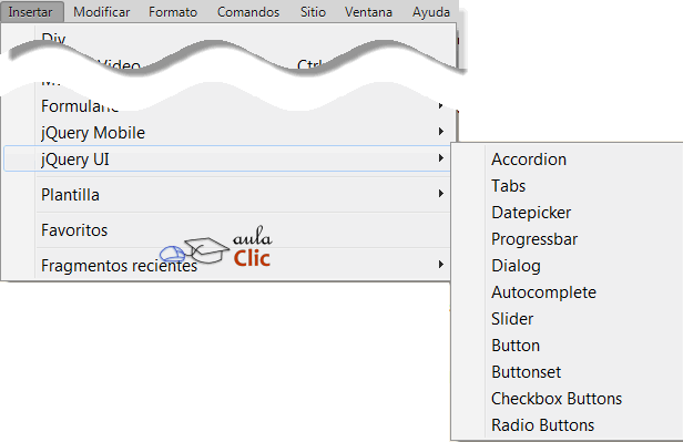 El conjunto de widgets de jQuery UI están disponibles tanto en el menú Insertar, opción jQuery UI, como en el panel Insertar, en la categoría del mismo nombre.